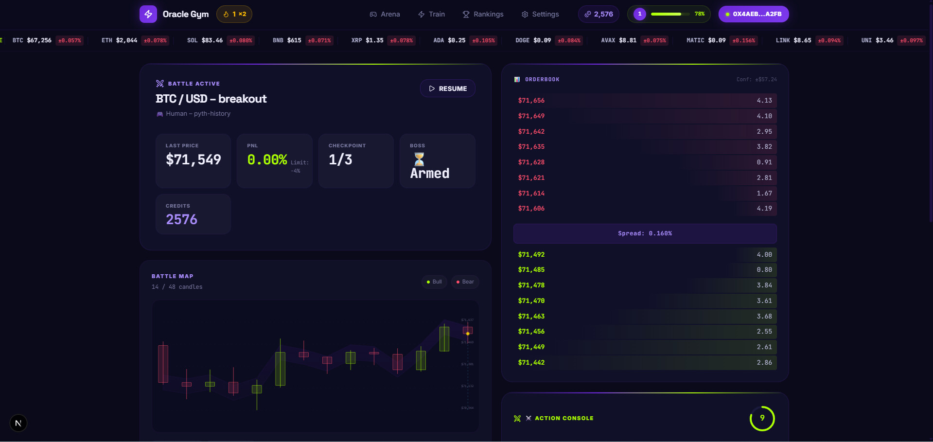 Oracle Gym transforms Pyth oracle data into an interactive trading training platform. Users replay historical market scenarios using real Pyth Price Feeds (price, expo, publish_time, conf) and face random “boss fight” events powered by Pyth Entropy V2. The platform features 6 scenario types, 3 difficulty tiers, and a 7-day streak system with coin multipliers (×2 to ×14). Each Pyth data point becomes part of the gameplay mechanics, turning raw oracle feeds into an engaging learning experience with performance scoring and trader archetype analysis.
