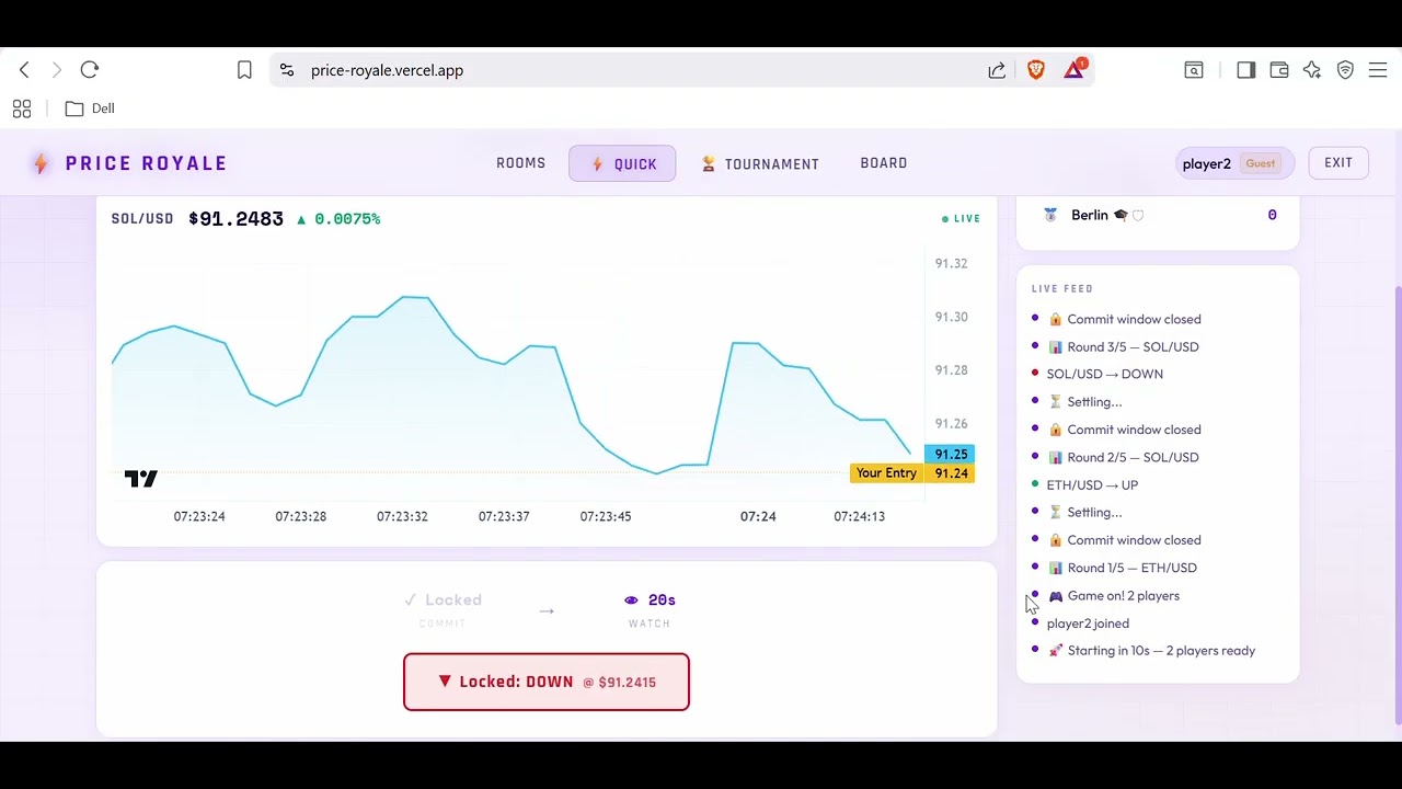 Price Royale turns Pyth Network’s live oracle data into a competitive multiplayer game. Players join rooms, commit directional predictions (UP or DOWN) on crypto asset prices within a 30-second window, then watch the Pyth-sourced price chart settle the outcome in real time for next 30-seconds. Three game modes — Custom Rooms, Quick Royale (auto-matchmaking), and Tournament (bracket elimination) — keep competition fresh, while a rank progression system, streak bonuses, and Pyth confidence interval multipliers reward both skill and timing.