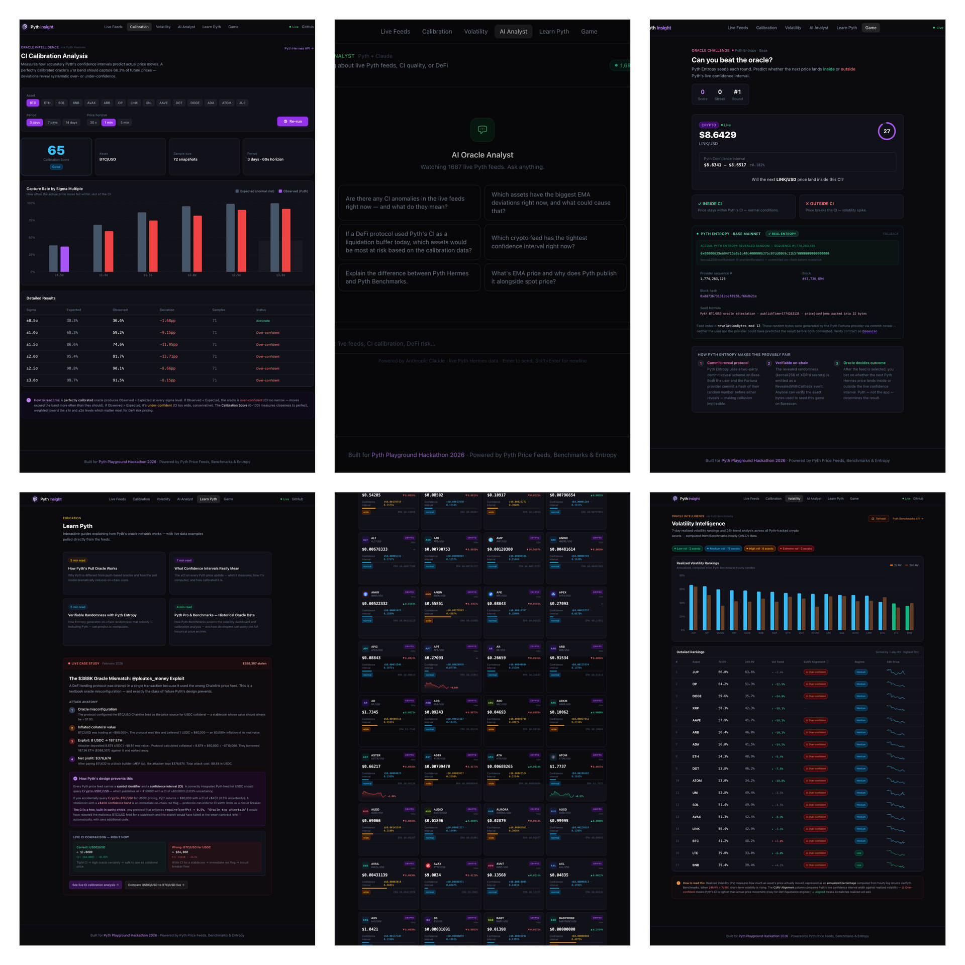 The CI Calibration page tests the statistical validity of Pyth’s ±1σ claim with real historical data. Both are unique and directly useful for DeFi protocol risk engineers.