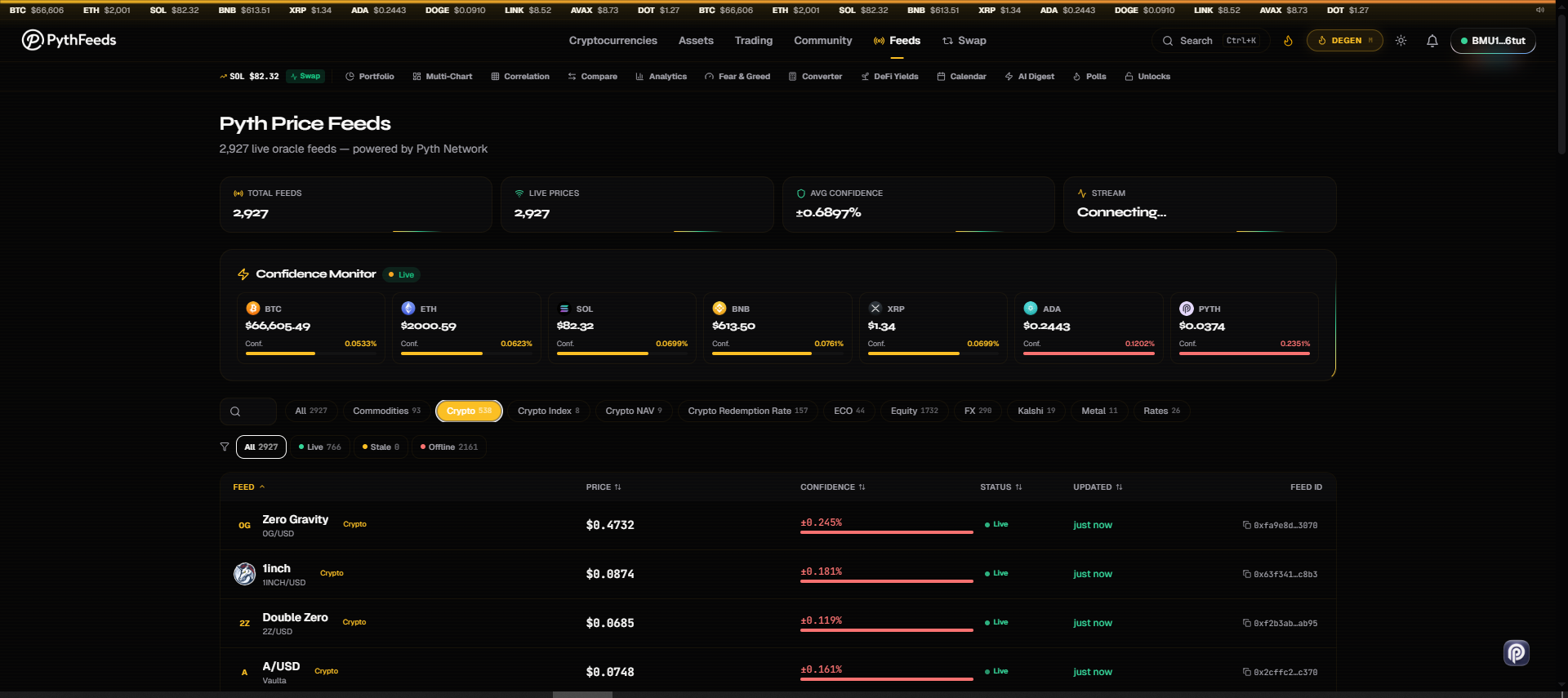 The /feeds explorer is the heart of it. Browse the full Pyth oracle surface ,search by asset, filter by staleness, inspect confidence bands, copy feed IDs, watch prices stream live. Itβs the oracle layer made browsable, not just a coin list with a Pyth badge slapped on.