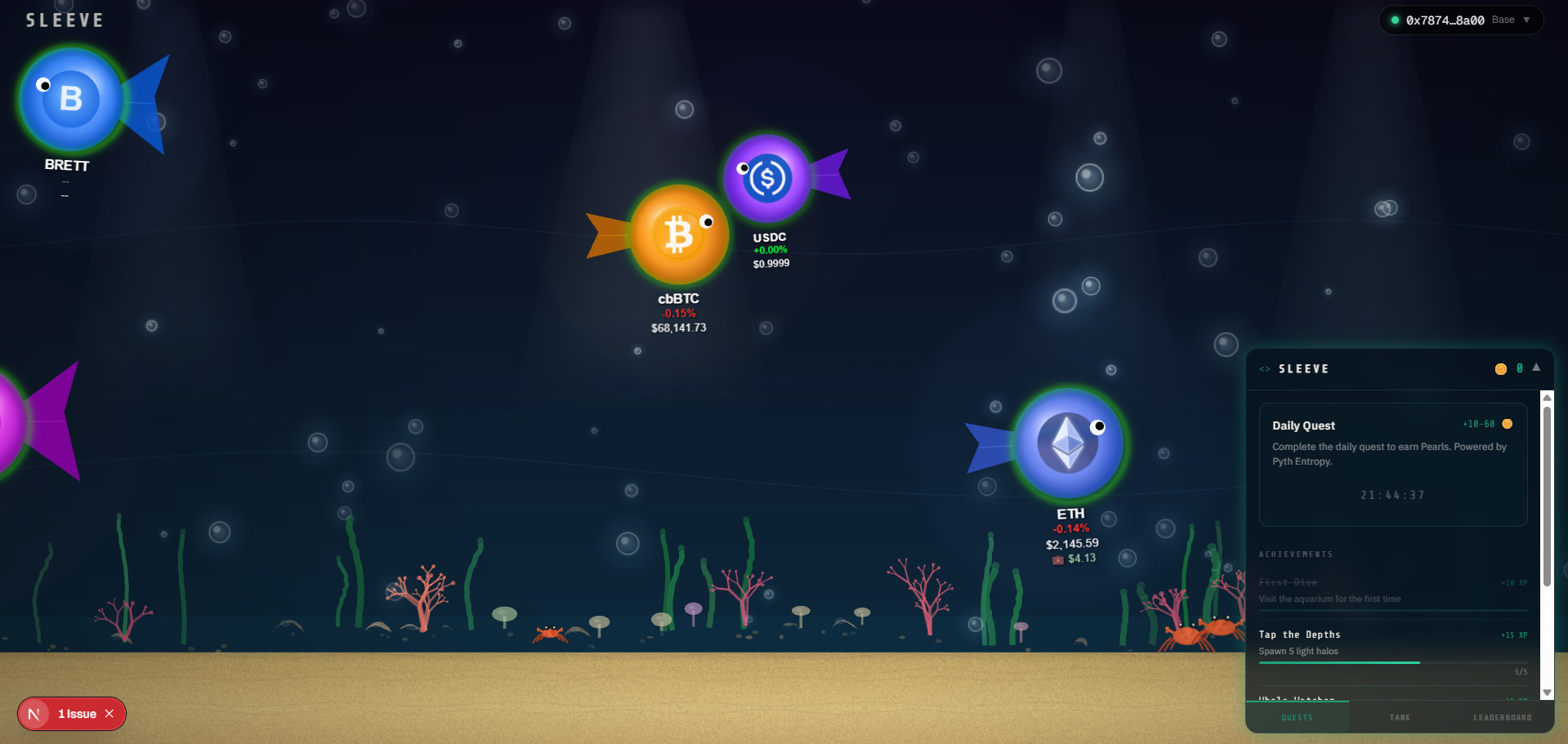 Sleeve is a gamified crypto portfolio app that transforms your on-chain holdings into a living underwater world. Users connect their wallet, watch their assets render as glowing weighted orbs in a dark aquarium scene, and earn Pearls through a daily quest system powered by Pyth Entropy for verifiable randomness. Real-time price feeds via Pyth Lazer Pro make the aquarium react live β orbs grow and shrink as markets move β deployed on Base mainnet.